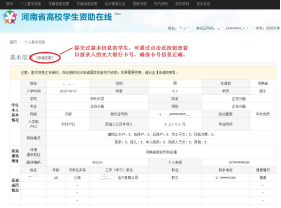 (1)完善个人基本信息,并提交审核。(新生首次登录必做此项,提交数据后院系审核激活,才能看到省级、校级资助项目申请的内容。个人信息中“开户银行”、“银行卡号”栏中,要求必须填写光大银行和个人光大卡号,用于日后发放助学金使用)