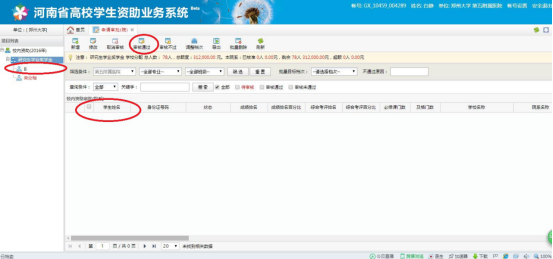 点击“国家资助”或“校内资助”,进入奖助金申请审核界面,首先点击某个项目如硕士学业奖学金中的“未分档”,然后在现实的学生名单中点击学生姓名前面的复选框后,点击“批量目标档次”下拉菜单选择该学生拟审核批准的档次后,点“调整档次”按钮。该生信息即可转入到所调整的奖助学金档次,然后在该档次中再次点击学生姓名前的复选框,点“审核通过”即可完成院系对该生该项目奖助学金的申请审核工作。如下图示;